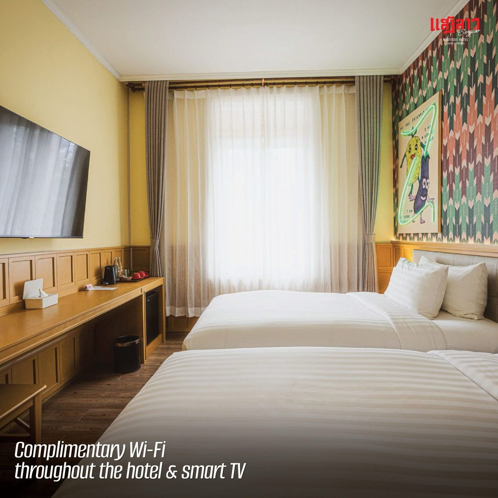 The 17 Classic Twin accommodations are located in both first and second floor of building, featuring ancient Lao retro decor, and pop-art color which is a fantastic blended, the design inspired from Lao’s Movie House in 80’s period.