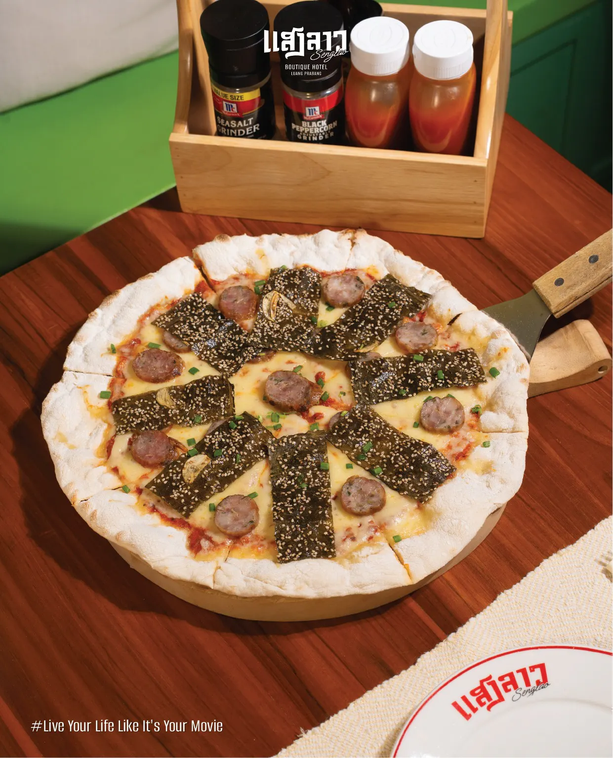 At Senglao Boutique, the homemade pizza feels like something familiar—but with a twist you don’t quite expect. It starts off classic: fresh dough, good cheese, that comforting, slightly crispy base. Then the Lao side comes in quietly—local herbs, a bit of spice, flavors that feel deeper and more fragrant than your usual slice.